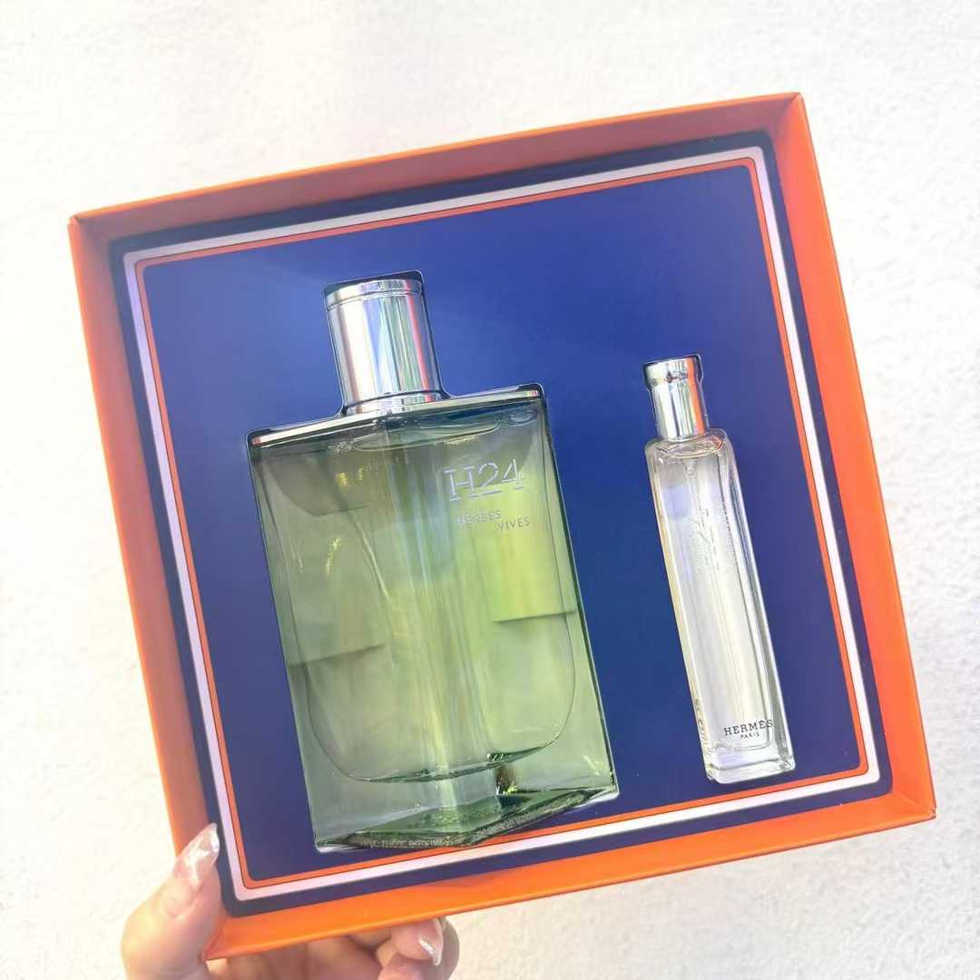 愛馬仕H24濃香水兩件套(H24濃香100ml+15ml旅行裝) 愛馬仕律動H24~活力與沈穩的完美融合 前調噴出來的一瞬間,是強烈刺激的檸檬氣息,彷彿在告訴你,打起精神,美好的的一天開始啦! 檸檬味散去,剩下淡淡的果香,有點像哈密瓜,西瓜,羊角蜜之類瓜果混合的味道。不是那種辨識度很強的瓜果味,有股柔和的果香。 到了中調,慢慢呈現出一種金屬質感,我個人覺得這是他最與眾不同的一部分。有大地那種礦物質感一脈相承的感覺,神秘而特別,這是我在任何其他品牌中沒有遇見的。 後調會過渡出更多的木質感,很淺的檀木味,像是稀釋了好多好多倍的羅意威時候清晨。以這個味道結尾,給人一種安心感。 前中後調的變化,像極了一個活力大男孩慢慢變成熟的過程。整個香調的變化非常有意思,是我近期接觸的最給我驚喜的一支香。 它的擴香和大地比起來很弱,上班能毫無壓力。留香的話,和大地差不多,只是它本身就淡淡的若有若無,而大地似乎會一下子從擴香王者,變得找不到它的蹤跡。